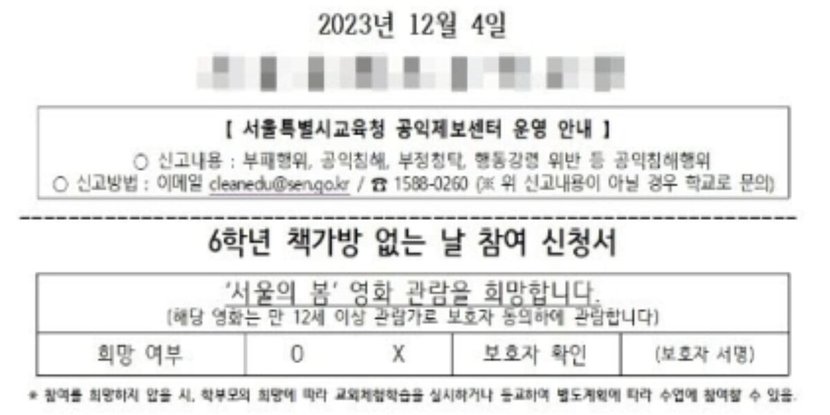 2023년 12월 6일 서울 송파구 송례초등학교는 "6학년 '책가방 없는 날' 영화 관람 계획을 취소한다"라고 안내했습니다.